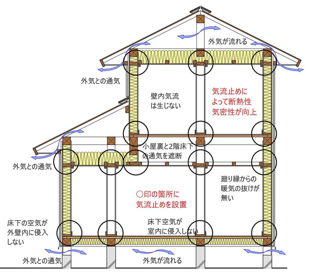 壁の上下に「気流止め」を設置することで、壁内を空気が流れるのを遮断。これにより、室内の暖かい空気が外に逃げたり、外の冷たい空気が壁内に侵入するのを防ぎます。 -