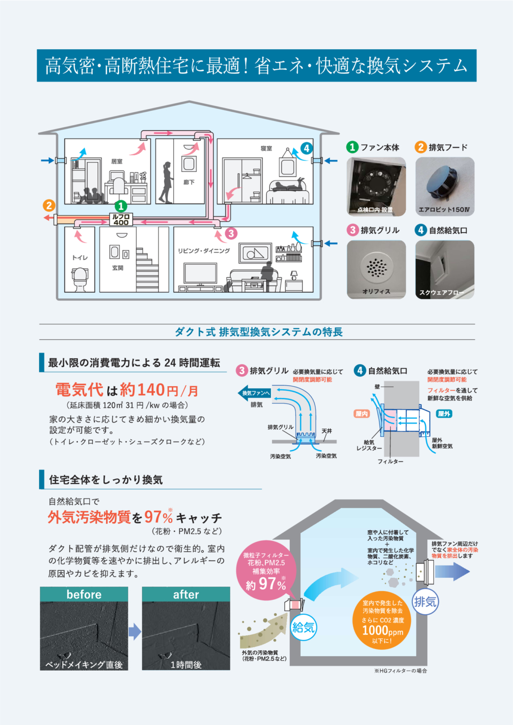 花粉やPM2.5などの有害物質をしっかりキャッチ。清潔な空気で家族全員が安心して過ごせます。 -