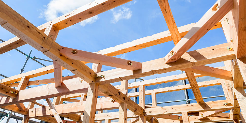 家の柱や梁を組み上げ、その後屋根を支える棟木を取り付けます。いよいよ、ここから内外装の工事に入っていきます。(ご契約金の40%お支払い)