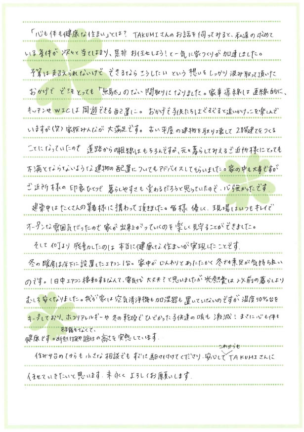 住み始めてからも小さな相談でもすぐに駆け付けてくださり、安心してこれからもTAKUMIさんに任せていきたいと思います。末永くよろしくお願いします。